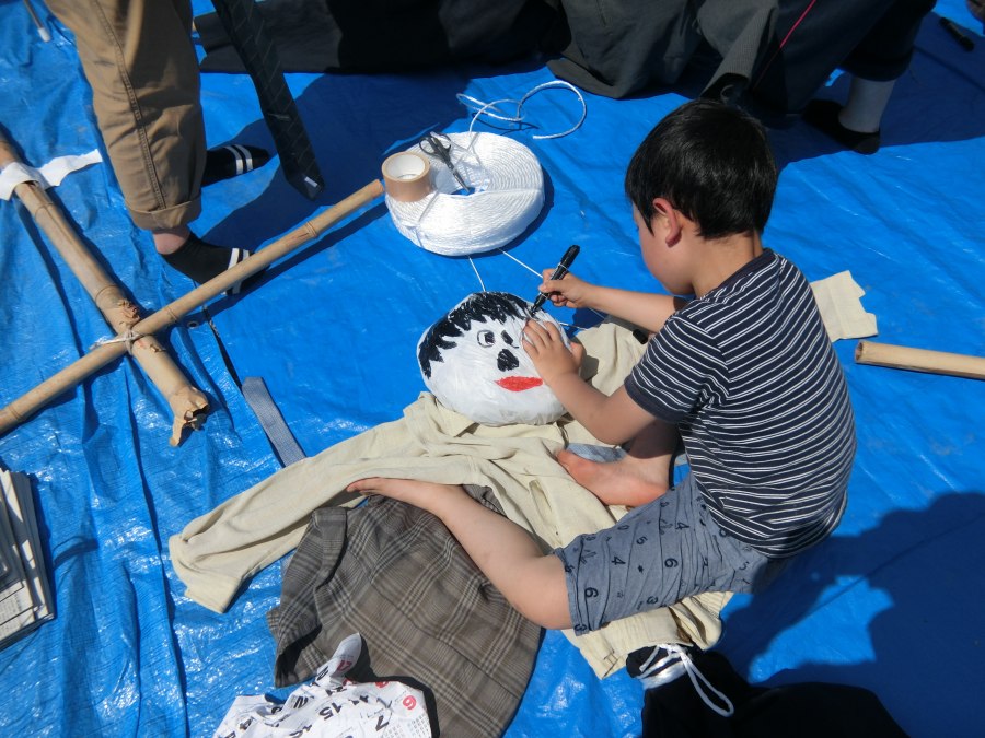 みんなで持ち寄った洋服を案山子(かかし)に着せ、それぞれ顔を描いて完成です。