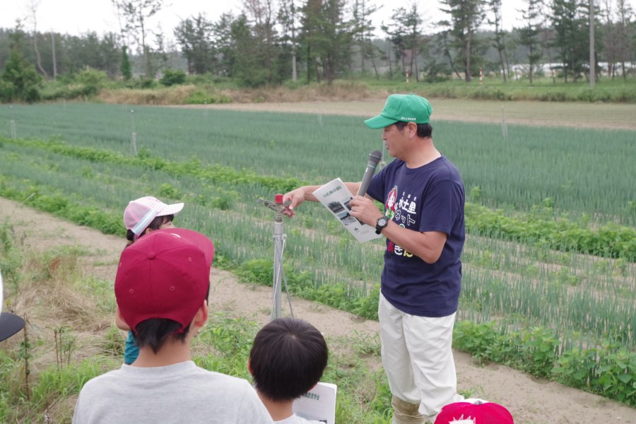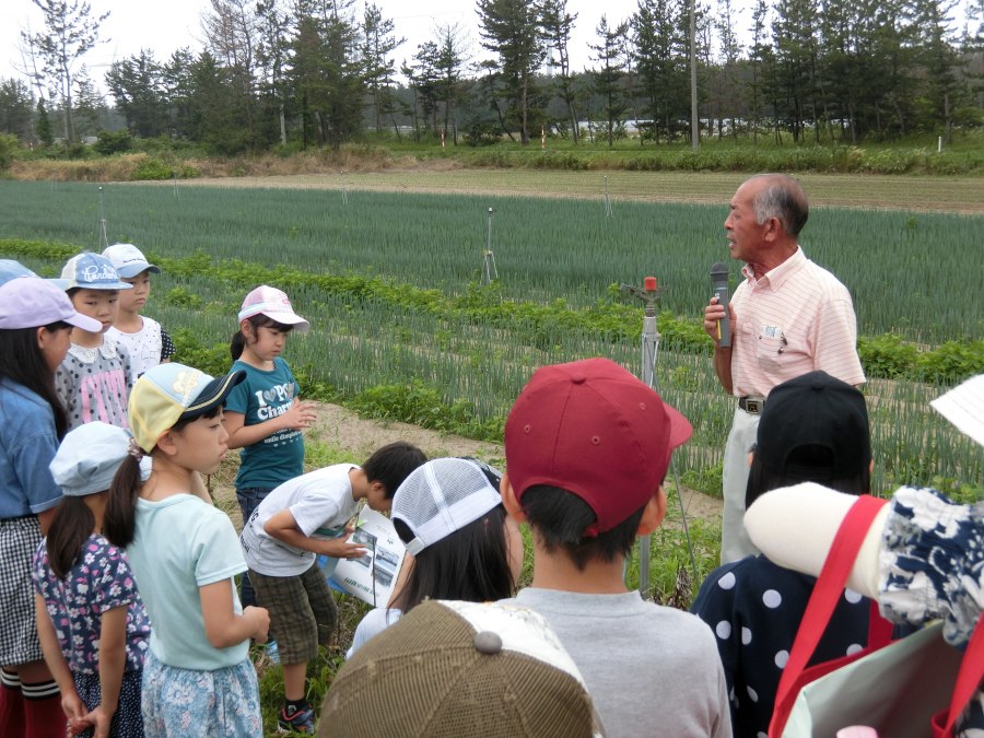 三種町浜口土地改良区の牧野理事長にご挨拶を頂き、同土地改良区の畠山事務局長の説明後、ネギ畑に設置のスプリンクラーを動かして頂きました。これには子ども達も大はしゃぎで水を被っていました。