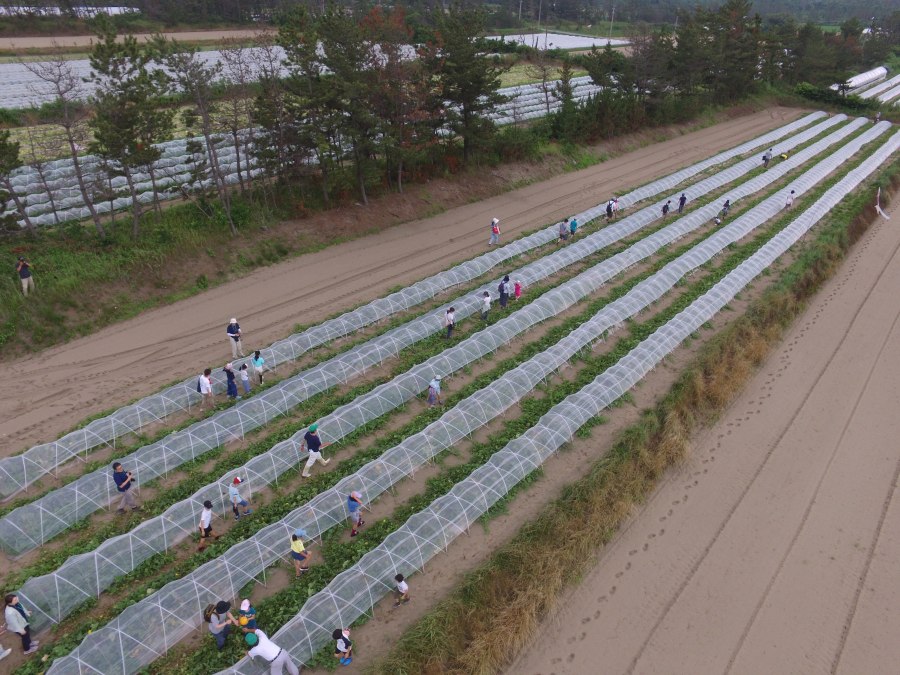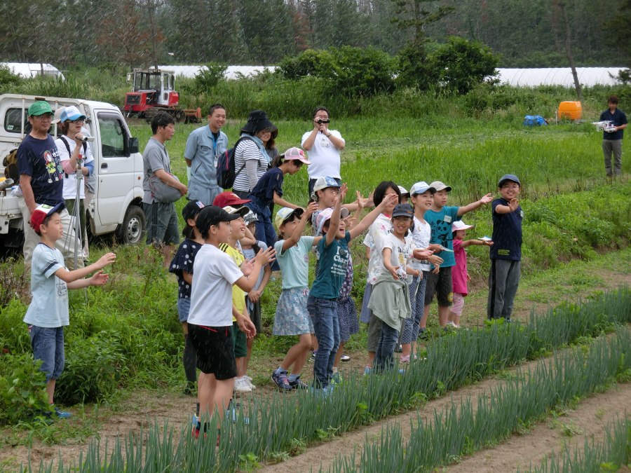 また、当日は秋田県山本地域振興局農村整備課所有の「ドローン」を飛ばして頂き、子どもたちの写真や動画の空撮も行いました。