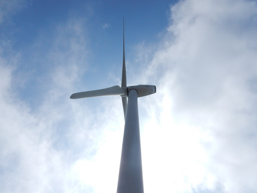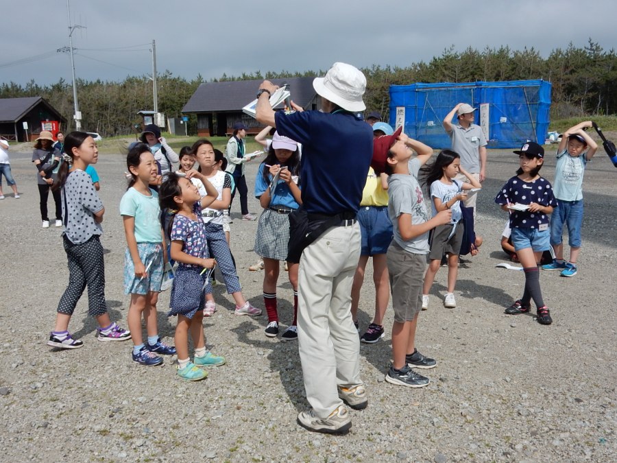 最後に「八竜風力発電所」の風車を見学しました。三種町の釜谷地区から芦崎地区へ南北方向に17基の風車が建てられており、三種町の7割にあたる5000世帯の年間消費電力を発電していると、水土里ネット秋田事業調整センターの松橋センター長からの説明があり、子どもたちは大きな風車を熱心に、そして眩しそうに眺めながら聴き入っていました。